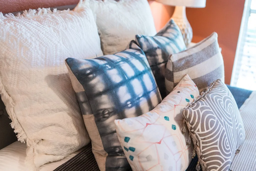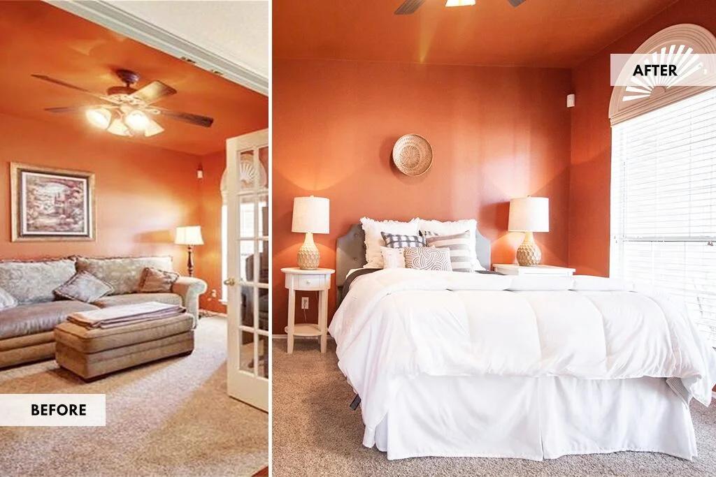 Typically, my home staging services include the 5 main areas of any home (living room, dining room, kitchen, and master bedroom and bathroom). However, this home featured a great multi-functional space right off the foyer that the McLoud's wanted to market as another bedroom. So, I brought in clean white linens, colorful pillows and modern furniture and decor to brighten up this bold orange bonus room in lieu of the master.